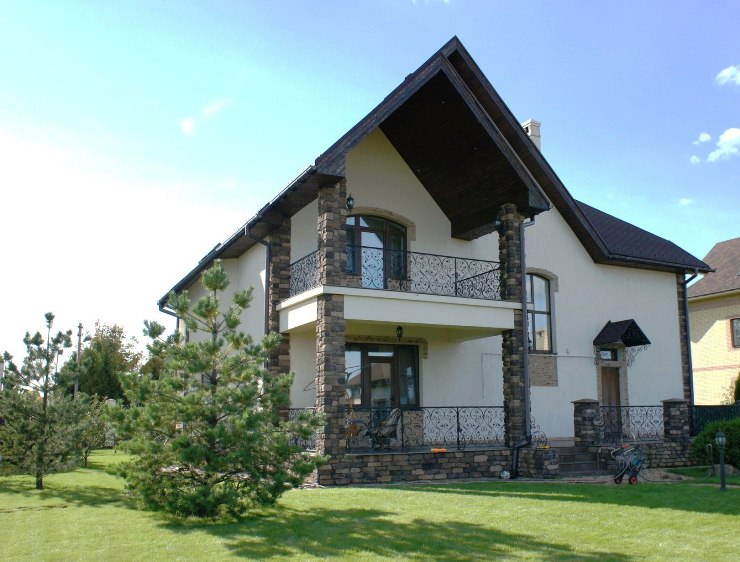 Дом выполнен из кирпича + утеплен, облицован диким камнем. Оборудован качественной мебелью и техникой: итальянский кухонный гарнитур со встроенной бытовой техникой Smeg, в гостиной установлен французский камин. В санузлах установлена сантехника лучших итальянских брендов. Французские гобелены на стенах. Мощное инженерное оборудование. Стильная отделка: на стенах венецианская штукатурка, обои. Пол - плитка с водяным подогревом, доска из массива дуба (искусственно состаренная). Двери из массива ореха (состаренные). Подоконники деревянные. Лестница бетонная, с кованым ограждением и дубовыми ступеньками. Сауна отделана тремя видами дерева - потолок из кедра, стены из липы, полки – африканский абаш.
