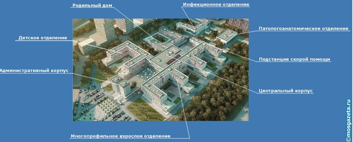 Также в больничный комплекс войдут 8-этажное здание взрослого многопрофильного блока на 606 мест, 5-этажное здание родильного дома на 130 мест и 8-этажное детского отделения на 180 мест. Здания инфекционного и патологоанатомического отделений будут отдельностоящими в северной части участка.